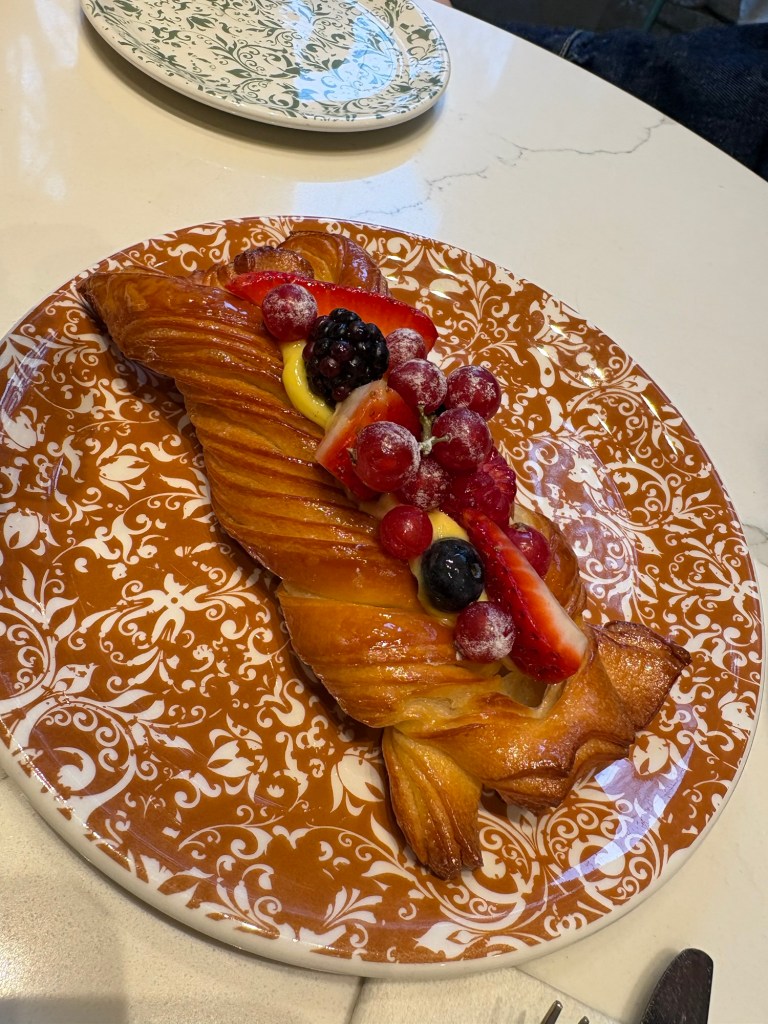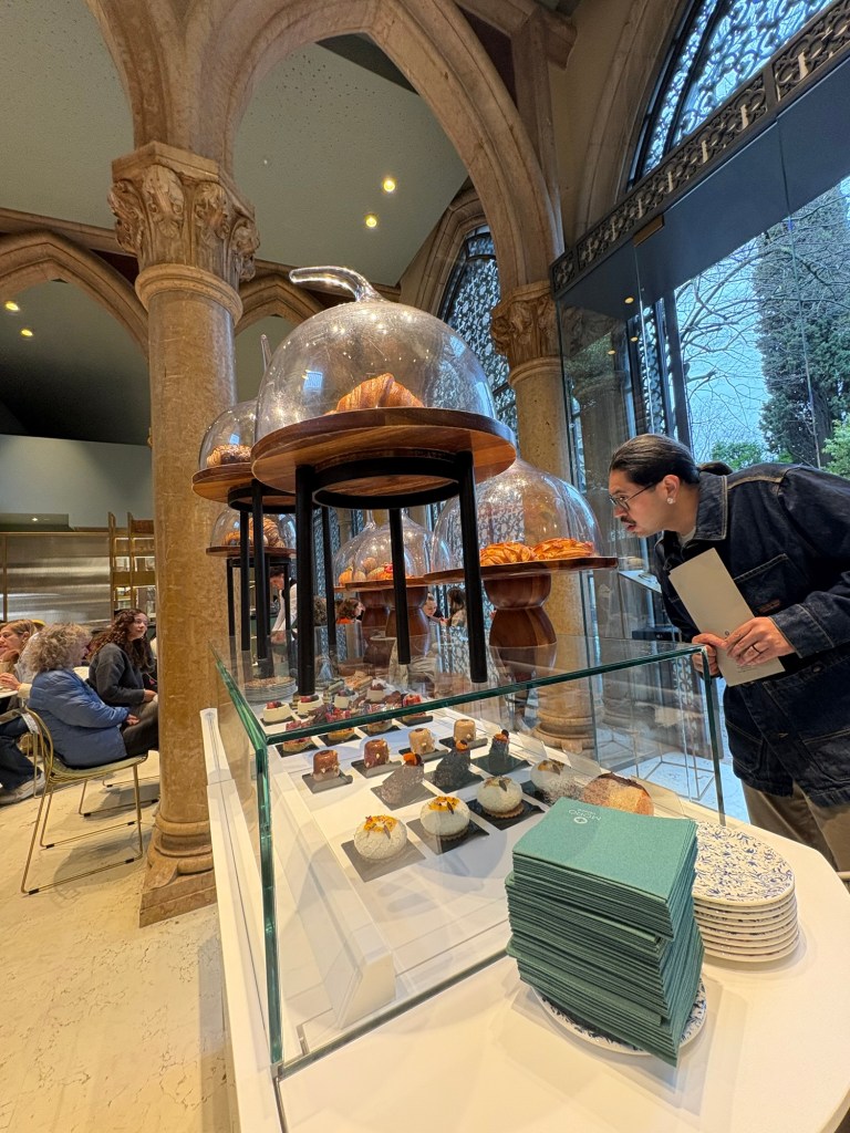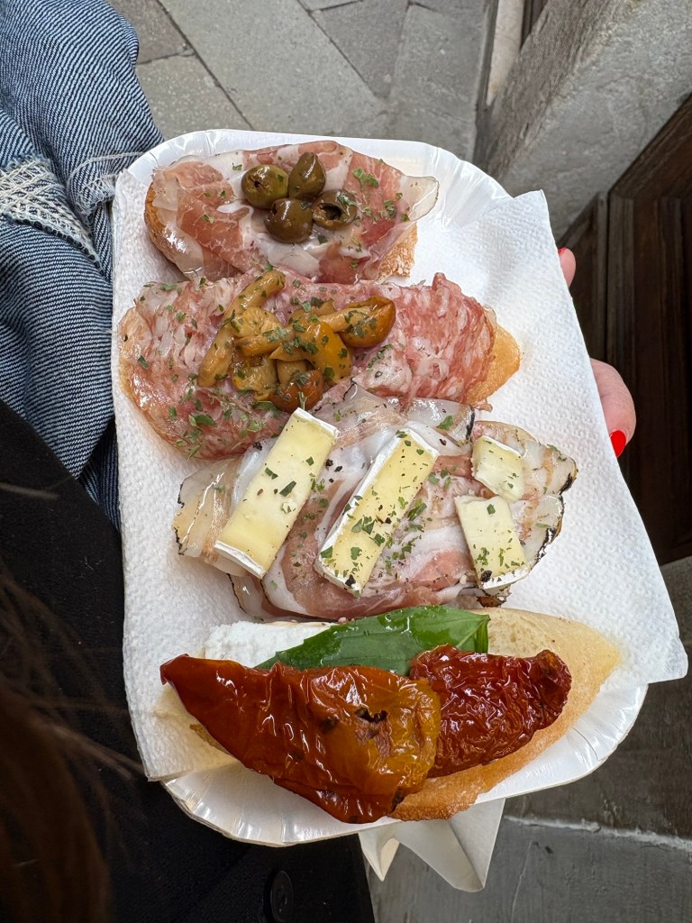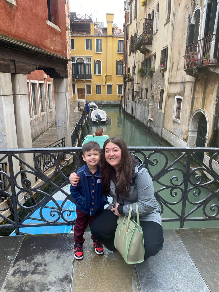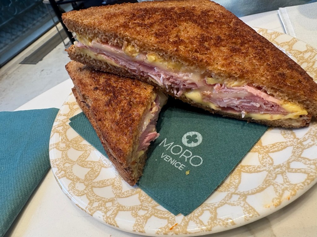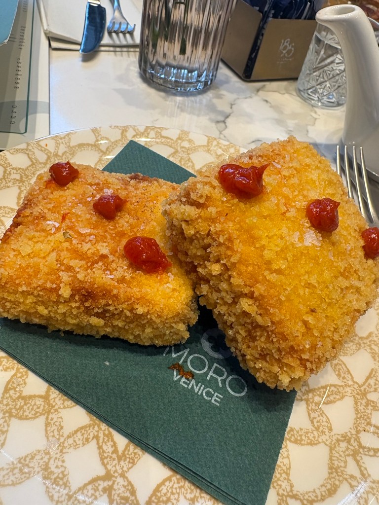 Moro Café was a hit! Delicious and absolutely stunning inside.This was not something I’d order for breakfast in the US, but when in Italy it seems perfectly fine to have a fried brick of mozzarella, Gorgonzola, basil, and sun dried tomatoesThen we were off on a mission for Venetian slippers!Chiesa di San Moisè – 8th century origin, facade completed in 1688Luckily right across the sidewalk was Bottega As we approached San Marco Basilica, the crowds got heavier, but we found the bridge of sighs!His face says “mom I’m trying to eat my gelato”And of course cicchetti